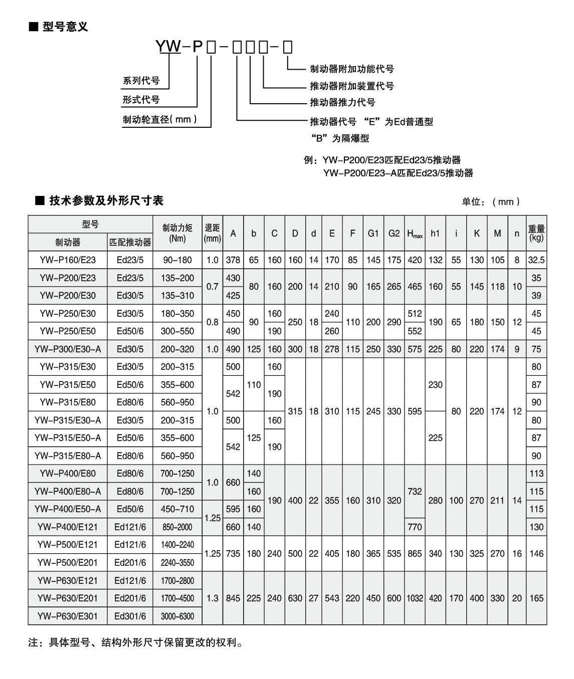 產(chǎn)品介紹:應(yīng)用:YWZ8,YWP系列電力液壓鼓式制動器,廣泛應(yīng)用于有防爆要求的各種起重運輸、皮帶運輸、港口裝卸、冶金及建筑機械中各種機構(gòu)的減速和停車(維持)制動。符合標準:YWZ8.YWP系列電力液壓鼓式制動器的連接尺寸和制動力矩參數(shù)符合JB/ZQ4388-86和GB6333-86(帶A系列)標準,技術(shù)要求符合JB / T6406-2006標準,配套符合DIN15430標準的Ed系列推動器。主要特點:▲ 聯(lián)鎖式退距均等裝置和瓦塊自動隨位裝置,可始終保持兩側(cè)瓦塊退距均等且無需調(diào)整,完全避免因退距不均使一側(cè)制動襯墊浮貼制動輪的現(xiàn)象;▲ 主要擺動鉸點均設(shè)有自潤滑軸承,傳動效率高,壽命長,使用中無需潤滑;▲ 制動彈簧在方管內(nèi)布置并設(shè)有標尺,用戶可十分方便地讀出制動力矩值,免去測量和計算的麻煩;▲ 制動襯墊為(帶卡槽)卡裝式整體成型結(jié)構(gòu),更換十分方便、快捷,備有半金屬(無石棉)硬質(zhì)和半硬質(zhì),軟質(zhì)(無石棉)等不同材質(zhì)的制動襯墊供用戶選擇;▲ 配套Ed系列電力液壓推動器產(chǎn)品,動作靈敏、使用壽命長;▲ 常閉式設(shè)計,(斷電)彈簧制動,(通電)推動器釋放。工作條件:◆ 海拔高度:<2000m;◆ 環(huán)境溫度:-20°C?+ 40°C;◆ 相對濕度:≤90%;◆ 工作制:間歇性(S3-60%)和連續(xù)(S1);◆ 電源電壓:三相交流,AC380 50Hz (其他電源等級可按需要定制);◆ 有特殊要求時在訂貨時協(xié)商確定?;緟?shù):● 產(chǎn)品型號:YWZ8-200、YWZ8-250、YWZ8-300、YWZ8-315、YWZ8-400、YWZ8-500、YWZ8-600、YWZ8-630、YWZ8-700、YWZ8-710、YWZ8-800● 適用輪徑:200~800mm● 制動力矩:135~10000Nm基本參數(shù):● 產(chǎn)品型號:YWP-200、YWP-250、YWP-315、YWP-400、YWP-500、YWP-630、YWP-710、YWP-800● 適用輪徑:200~800mm● 制動力矩:80~12500Nm